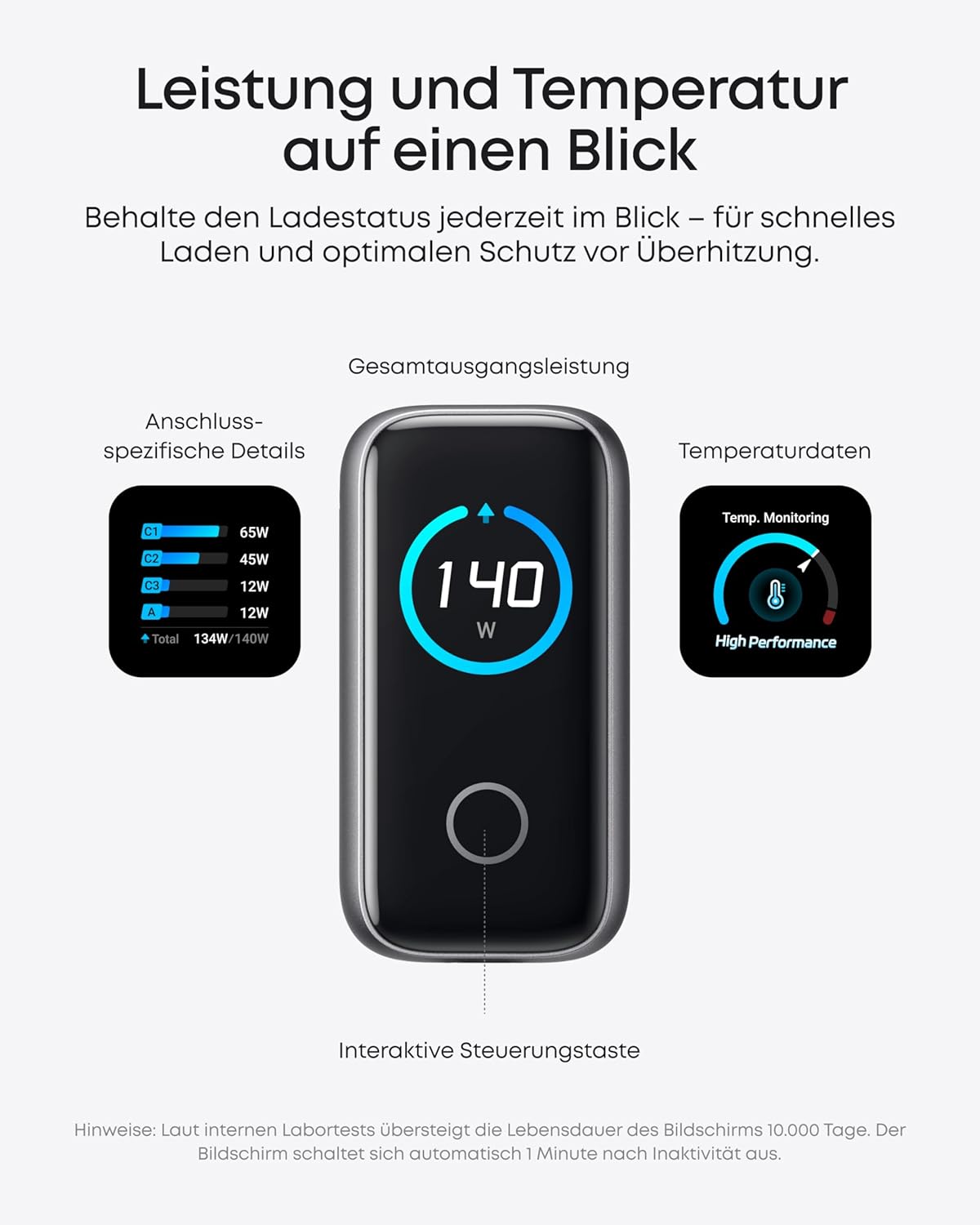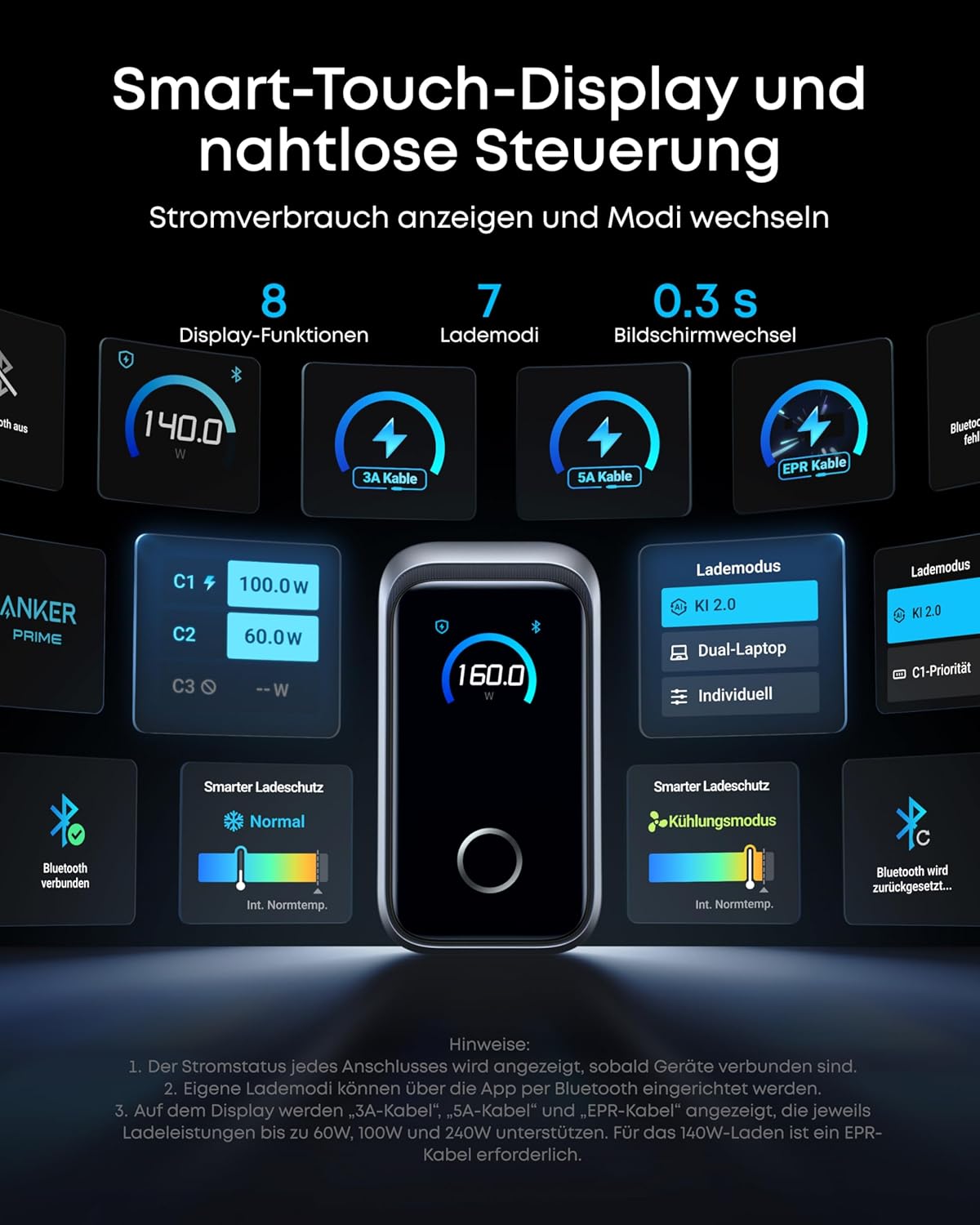Anker Prime Charger,160W 3-Port Compact GaN USB C Charger Block,Smart Display and Touch Control,Up to 140W Single‑Port Charging,for MacBook Pro,Laptop,iPhone 17 Series(Cable Not Included,Non-Battery)